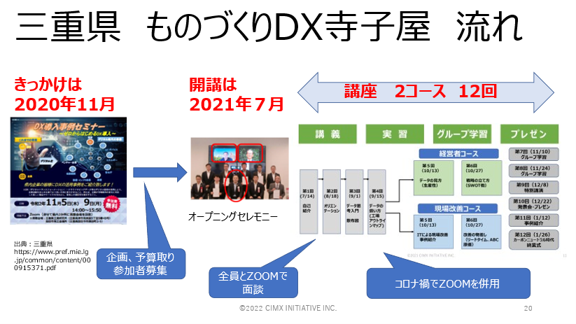 三重県と三重のものづくり中小企業を強くするための議論を重ねる中で、全12回の講座を2コース(経営者向けと現場管理者向け)行うことを提案しましたが、人にものを教えることも講座を作ることも人生初めての経験でした。その上リモートという聴衆の反応がつかめない中での講演にもかかわらず成功できたのは、熱心に聞いてくれた受講生の皆さんと、運営に協力していただいた三重県庁、三重県産業支援センターの皆さん、そして弊社のスタッフの献身的な仲間のおかげです。ここで改めて感謝の言葉を贈ります。近い日に打ち上げ会ができることを願っています。